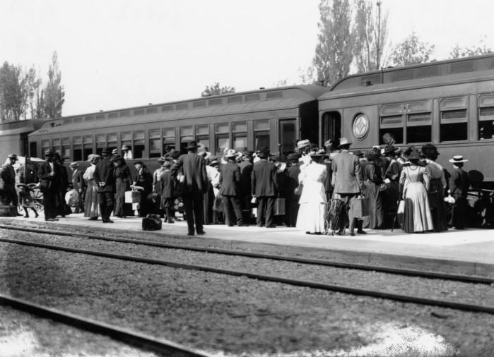 Passengers line up to board the first train on the opening day of the Denver and Rio Grande Depot. Digital Image © 2008 Utah State Historical Society. All Rights Reserved.
