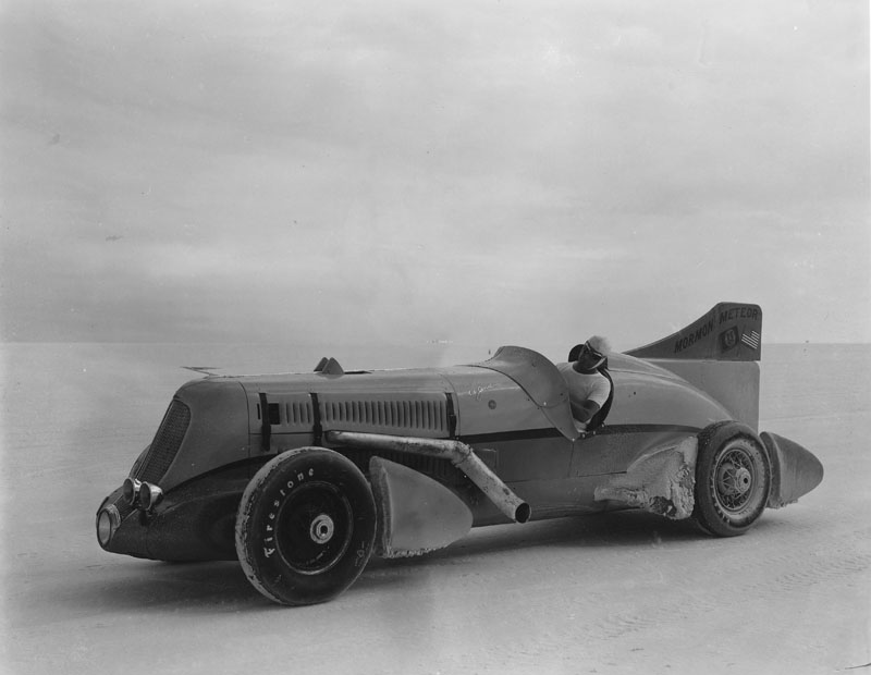 Ab Jenkins racing his "Mormon Meteor" across the Bonneville Salt Flats, circa 1936-1939. Photo courtesy of the Special Collections Archive at the J. Willard Marriott Library, University of Utah.